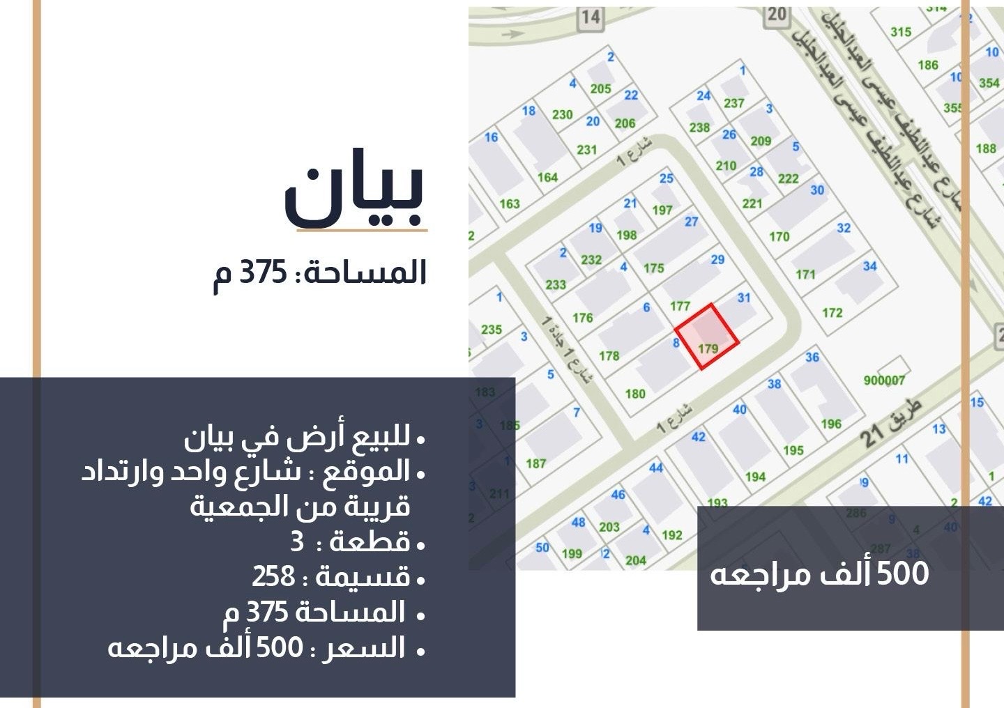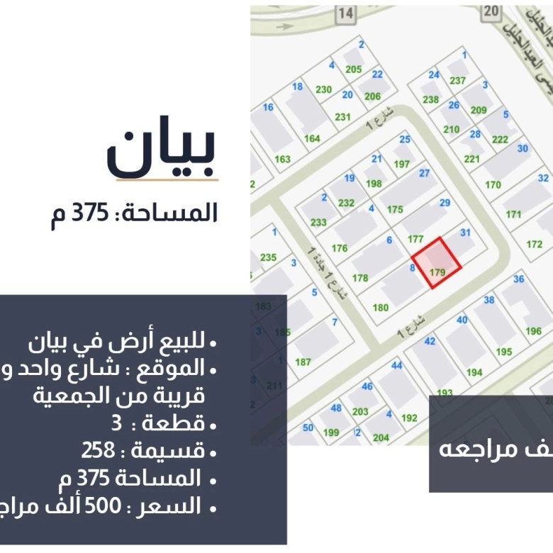 للبيع أرض • بيان • قطعة 3 • المساحة 375 م2 ، شارع واحد وارتداد قريبة من الجمعية ، أرتداد 8,5 م2 ، مراجعة 485 ألف