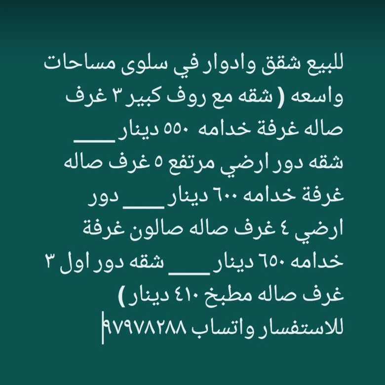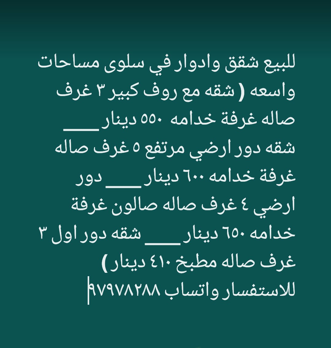 للبيع شقق وادوار في سلوى مساحات واسعه ( شقه مع روف كبير ٣ غرف صاله غرفة خدامه ٥٥٠ دينار ____ شقه دور ارضي مرتفع ٥ غرف صاله غرفة خدامه ٦٠٠ دينار ____ دور ارضي ٤ غرف صاله صالون غرفة خدامه ٦٥٠ دينار ____ شقه دور اول ٣ غرف صاله مطبخ ٤١٠ دينار ) للاستفسار واتساب ٩٧٩٧٨٢٨٨